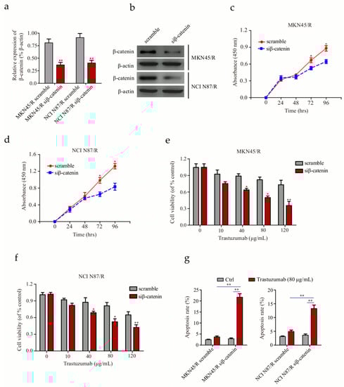 Knockdown of β-catenin enhances the sensitivity of trastuzumab-resistant gastric cancer cells to trastuzumab (a,b) Evaluation of β-catenin knockdown in trastuzumab-resistant MKN45 and NCI N87 cells by real time-polymerase chain reaction (RT-PCR) and Western blot respectively; (c,d) Knockdown of β-catenin via small interfering RNA (siRNA) targeting β-catenin (siβ-catenin) decreased proliferation of MKN45/R and NCI N87/R cells; (e,f) Knockdown of β-catenin induced a decrease of living cells after trastuzumab treatment; (g) Detection of cell apoptosis by Annexin V/PI staining upon treatment with 80 μg/mL trastuzumab for 96 h. All data represent three independent experiments. * p < 0.05, ** p < 0.01 vs. control.