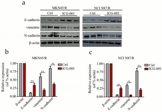 To gain further insights into the inhibition of Wnt/β-catenin pathway in regulating the EMT process, we carried out Western blot to examine the expression of E-cadherin, N-cadherin, and vimentin which are EMT-related markers. Comparing with the control group, E-cadherin was significantly up-regulated, while N-cadherin and vimentin were down-regulated in MKN45/R and NCI N87/R cells after treatment with ICG-001 for 48 h (Figure 8a–c). Our results indicated that ICG-001 reversed the decrease of E-cadherin, and the increase of N-cadherin and vimentin in MKN45/R and NCI N87/R cells, manifesting that inhibition of β-catenin signaling by ICG-001 reverses EMT in trastuzumab-resistant gastric cancer cells.