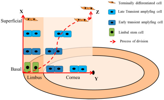 LSCs play an important role in homeostasis of corneal epithelium. They divide into TACs by mitosis, retaining less stemness. Due to progressive loss of stemness along with multiple rounds of division, TACs finally divided into the terminally differentiated cells (TDCs) [30]. This process takes over two weeks [47]. The X/Y/Z hypothesis, proposed by Thoft et al., on the progress of LSC division is well recognized (Figure 2) [55]. They regard anterior migration from cells of the basal epithelium as “X”, centripetal migration from the limbus as “Y”, and desquamation from the surface as “Z”. The X/Y/Z hypothesis is related to the corneal epithelium being maintained, and cell loss must be balanced by cell replacement, i.e., X + Y = Z. The hypothesis has been proved by Kasetti et al. [7]. They found that the LSCs are located at limbus and progressively differentiate from limbus to the central cornea by using the transgenic mouse system. In the process of cornea wound healing, they found that LSCs were centripetal migration from the limbus and formed 2–3 layers of cells in the wound area at the healing beginning, and then gradually increased cell layers over time, eventually restoring the function of the cornea. Interestingly, they also found a fixed division capacity of TAC progenitors derived from LSC, which are subjected to the process of wound healing [7].
