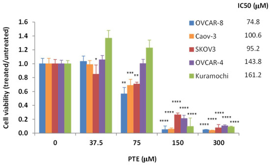 Pterostilbene (PTE) inhibits ovarian cancer cell viability. Cells were treated with vehicle (DMSO) or PTE (37.5–300 μm) for 72 h. Cell viability was determined using MTT assay. Data are expressed as the ratio to control treated with vehicle (DMSO). IC50 values of pterostilbene were determined by the Chou-Talalay method. Results are representative of 3 or more experiments, each with 3 or more replicates. *, p < 0.05, **, p < 0.005, ***, p < 0.0005, ****, p < 0.0001, versus control treated with vehicle.