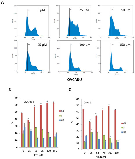 Pterostilbene suppresses cell cycle progression. OVCAR-8 and Caov-3 Cells were treated with vehicle and PTE (25–150 μm) for 24 h. The treated cells were labeled with PI for DNA contents and analyzed by flow cytometry. (A) Representative histograms of cell cycle analysis of OVCAR-8. (B,C) Cell cycle distribution of OVCAR-8 and Caov-3. The data indicate the percentage of cells in each phase of cell cycle. Results are representative of 3 or more preparations. *, p < 0.05, **, p < 0.005, ***, p < 0.0005, versus control treated with vehicle.