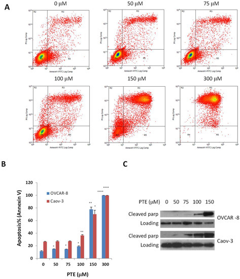 Pterostilbene induces cell apoptosis. OVCAR-8 and Caov-3 cells were treated with vehicle and PTE (25–300 μm) for 48 h. Apoptosis was determined by flow cytometry using annexin V and PI staining (A,B) or by Western blot for the expression of cleaved poly-ADP ribose polymerase (PARP) (C). Results are representative of 3 or more preparations. *, p < 0.05, **, p < 0.005, ****, p < 0.0001, versus control treated with vehicle.