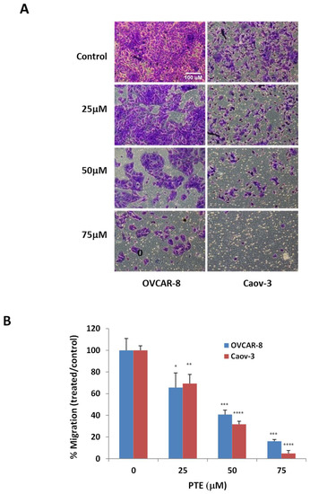Cell migration was assayed using 24 mm diameter chambers with 8 μm pore filters (BD BioCoat 24-well plate 8.0 micron, BS Biosciences, Franklin Lakes, NJ, USA). Cells were grown in serum-free medium overnight. Cells were trypsinized and resuspended in serum-free medium, and then 200 μL of cell suspension (7.0 × 104 cells) plus pterostilbene (25–100 μm) was added to the upper chambers. The lower chambers were filled with 800 μL of 10% FBS medium and incubated for 2 days for OVCAR-8 cells and Caov-3 cells. The filters were then fixed with 4% PFA for 10 min, washed with PBS 2x and stained with 0.2% crystal violet for 10 min. The upper surfaces of the filters were wiped with Kimwipes® to remove non-migrated cells. The migrated cells were counted using Image-Pro program (Media, Cybernetics, Warrendale, PA, USA).