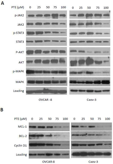 Pterostilbene (PTE) was kindly provided by Chromadex, Inc., Irvine, CA, USA. Antibodies against p-STAT3 (Y705), STAT3, p-ERK (T202/Y204), ERK, p-AKT (S473), p-JAK2 (Y1007/1008), JAK2, BCL-2, Cyclin D1, PARP, and GAPDH were obtained from Cell Signaling Technology (Danvers, MA, USA). The antibodies against AKT and MCL-1 were from Santa Cruz Biotechnology (Dallas, TX, USA).