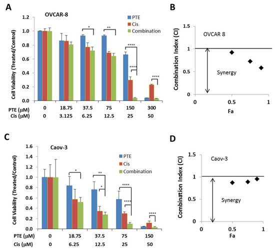 Pterostilbene enhances anti-tumor activity of cisplatin. OVCAR-8 (A,B) and Caov-3 (C,D) cells were treated with cisplatin and PTE either alone or in a combination at various concentrations in a fixed molar ratio. Cell viability was determined 48 h later (A,C). Data are expressed as the ratio to control treated with vehicle (DMSO). (B,D) Combination Index (CI) values. CI values in black diamond were determined by Chou-Talalay method using the Calcusyn software.Results are representative of 3 or more experiments, each with 3 or more replicates. *, p < 0.05, **, p < 0.005, ****, p < 0.0001, versus control treated with vehicle.