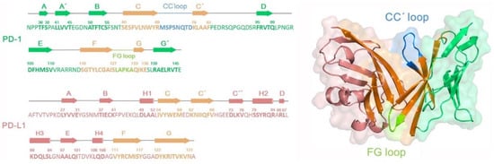 It is necessary to briefly understand sequence and structure of the PD-1/PD-L1 system (see Figure 3) prior to investigating molecular recognition between PD-L1 and antibody molecules, as well as the rational PD-L1 antibody modification. As shown in Figure 3, the secondary structure of PD-1 contains a large number of β-sheets, among which the orange parts are involved in the binding of PD-L1 or antibodies with the help of CC’ (in blue) and FG loops (in light green). The CC’ loop region undergoes conformational rearrangement after binding PD-L1, while the conformation of FG loop is rather conservative favoring the structural maintenance []. As for PD-L1, the secondary structure consists of 4 α-helices and 9 β-sheets. C/C’/F/G regions (in orange) of PD-L1 are important for binding PD-1 or antibodies. It is worth mentioning that PD-1 and PD-L1 comprise a group of disulfide bonds, such as C54-C123 and LC40-LC114, which plays a key role in maintaining the stable interactions among β-sheet groups and improving the rigidity of the whole molecule [].