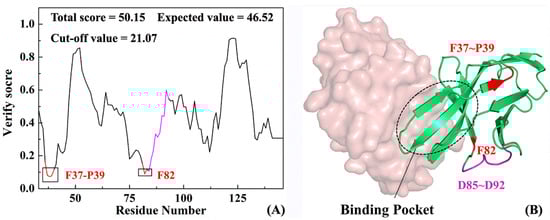 Verify score (A) and corresponding 3D structure (B) of the PD-1 system. Red indicates the region with high verify score that the modeling result is slightly poorer and pink shows the missing residues D85–D92.