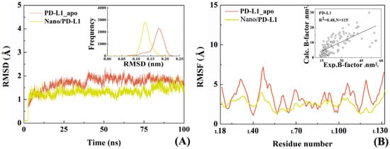 Subsequently, the overall conformational properties were analyzed for the Nano/PD-L1 system. Figure 5 comparatively shows the change of Cα atomic RMSD in PD-L1_apo and Nano/PD-L1 over time. The Cα atomic RMSD of PD-L1 from equilibrium MD trajectories reduce from 1.71 ± 0.22 Å to 1.30 ± 0.18 Å after the recognition by nanobody, however the RMSD values of the Nano maintained at 0.80 + 0.18 Å during the simulation. Compared with the RMSD value of PD-1/PD-L1 (2.10 ± 0.24 Å), nanobody and PD-L1 can form a more stable complex than the endogenous PD-1/PD-L1 complex. It is observed that the RMSF distribution of PD-L1 in the two systems (i.e., PD-L1_apo and Nano/PD-L1) are similar, notwithstanding, nanobody significantly weakens the flexibility of PD-L1_apo of which the RMSF value fluctuated around 3 Å. Especially, the local flexibility of β-sheets (LI54-LM59, LK62-LV68, LV111-LS117 and LD122-LN131) in the Nano/PD-L1 is much lower than that in PD-1/PD-L1. According to the difference between the mean RMSD values calculated by the equilibrium section of the trajectories (20–100 ns) of PD-1/PD-L1 and Nano/PD-L1, the latter is much more stable than the former in the simulation process. In this work, the trajectories of 20–100 ns in each system were selected for the subsequent conformational analyses. The radius of gyration analysis, on the other hand, also hinted the volume of Nano/PD-L1 has not changed substantially (see Figure S3). As shown in Figure 5, in a nutshell, two viewpoints can be gained. First, the association of nanobody leads to the global and local conformational change of PD-L1 and the conformational change and motion mode both are necessary to be analyzed in detail. Then, the satisfactory correlation between the experimental B factors and the calculated ones (R2 = 0.48, N = 115) also suggests that our productive MD is rational and dependable.