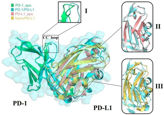 Superimposition of crystal structures for the PD-1_apo (in green), PD-1/PD-L1 (in blue), PD-L1_apo (in brown) and Nano/PD_L1 (in yellow) systems. Region I shows the structural differences of the CC’ loop compared to the PD-1_apo and PD-1/PD-L1 systems. Region II and III show the structural difference of β-sheet groups between PD-L1_apo and PD-1/PD-L1, as well as between Nano/PD-L1 and PD-1/PD-L1.