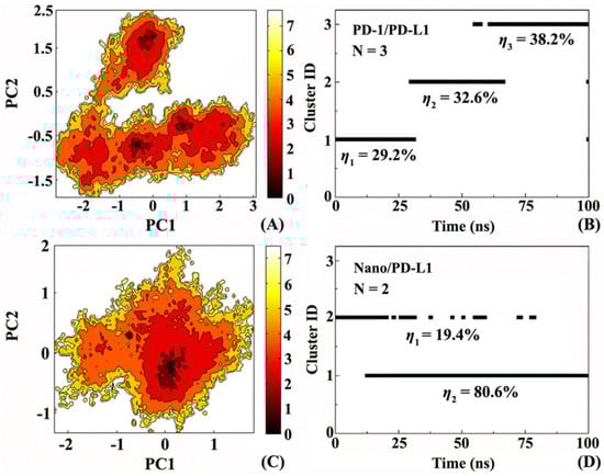 Free energy landscape and the corresponding conformational cluster analyses for the PD-1/PD-L1 (A,B) and Nano/PD-L1 (C,D) systems. PC1 and PC2 respectively represent principal component 1 and 2.