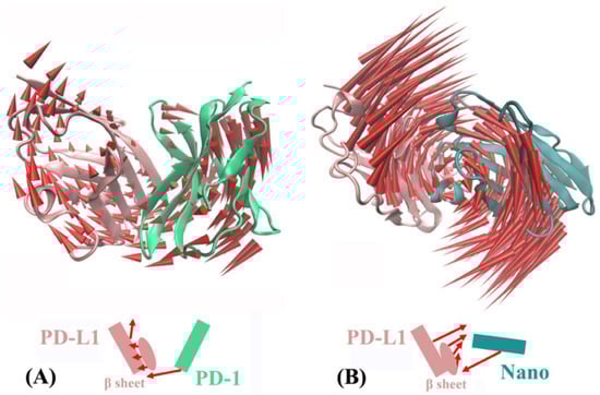 The first slow motion mode of the PD-1/PD-L1 (A) and Nano/PD-L1 (B) systems.