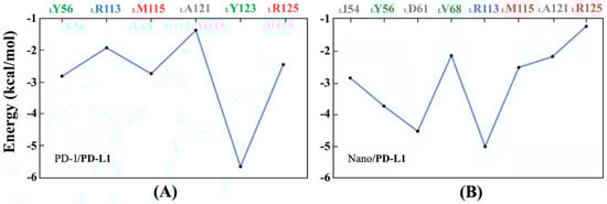 First of all, Molecular Mechanics/Generalized Born Surface Area (MM/GBSA)energy decomposition was utilized to predict the key residues favoring the formation of the PD-1/PD-L1 and Nano/PD-L1 systems. Figure 11 shows the pivotal residues with binding energies less than −1 kcal·mol−1. From Figure 11A, it is found that LY56, LR113, LM115, LA121, LY123 and LR125 residues all have relatively lower binding energy in the PD-1/PD-L1 system and LY123 may be particularly important for PD-1/PD-L1 recognition after jointly considering Figure 10. Figure 11B shows eight key residues (i.e., LI54, LY56, LD61, LV68, LR113, LM115, LA121 and LR125) in Nano/PD-L1 with energies less than −1 kcal·mol−1, two more residues than that of PD-1/PD-L1. Moreover, the binding energy of LR113 significantly decreased from −1.92 to −5.02 kcal·mol−1 by MM/GBSA method, thus LR113 is identified as one of the key residues in the recognition of antibodies and receptors, which is consistent with the previous analyses of dihedral distribution (see Figure S6) and pKa (see Figure 10).
