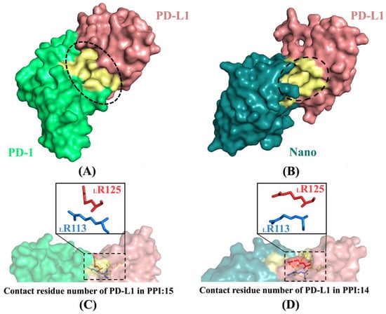 PD-L1 binds to PD-1 or Nano with multiple non-bonded interactions between amino acids distributing on PPI such as hydrogen bonds, salt bridges and hydrophobic interactions [,] (more details see Figure S7). Figure 12 shows the contact surfaces and conformational changes of two key residues (i.e., LR113 and LR125) in the PD-1/PD-L1 and Nano/PD-L1 systems. There are three small and deep grooves in the PPI of PD-1/PD-L1 (see Figure 12A), while just only one deep binding groove in the same position of Nano/PD-L1 (see Figure 12B), confirming that the antibody binds to PD-L1 admirably. In addition, similar to the literature data [,], there are 15 and 14 residues of PD-L1 involved in the formation of PPI for the PD-1/PD-L1 and Nano/PD-L1 systems, respectively. After the association of PD-1 and nanobody, the conformations of LR113 and LR125 changed significantly (see Figure 12C,D). In detail, LR113 regulated the position of terminal amino group in order to better interact with the opposite ND99 in the Nano/PD-L1 system and LR125 approaches to LR113 so that the conformation of LR125 was also adjusted to accommodate LR113.