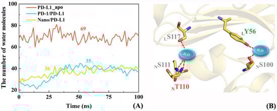 The changes of the number of interface water in PD-L1_apo, PD-1/PD-L1 and Nano/PD-L1 systems over time were briefly examined to investigate whether interfacial water molecules mediate some intermolecular hydrogen bonds. Based on the snapshots sampled every 500 ps for 100 ns, Figure 13A shows the alteration of the number of water molecules within 4 Å around the β-sheet groups for the PD-L1_apo, PD-1/PD-L1, Nano/PD-L1 systems. The average numbers of water molecules are 69, 35 and 36 in the three systems, implying the similar solvation environment of the PPIs in the two complex systems. In addition, the number of PD-1/PD-L1 interface water increased slightly from 0 to 50 ns, reflecting the expansion of the PD-L1/PD-L1 and Nano/PD-L1 systems during the MD simulation process, which is consistent with the previous contact residue analyses (see Figure 7). In the Nano/PD-L1 system, two interface water molecules exist most of the time, forms the stable water-mediated hydrogen bonds with LS117, NS111, NT110, LY56 and NS100 in turn.