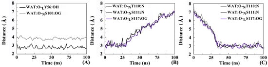 The distance between the hydrogen bond acceptor and donor varies with time. (A) LY56 (black line) and NS100 (gray line) with water molecule; (B) NT110 (gray line), NS111 (black line) and LS117 (purple line) with water molecule; (C) NT110 (gray line), NS111 (black line) and LS117 (purple line) with water molecule.