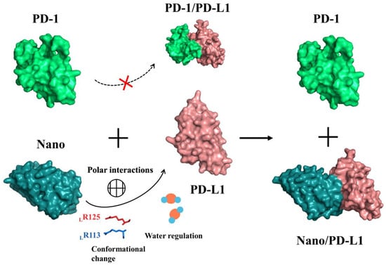 The characteristic of Immune checkpoint molecules including PD-1/PD-L1 and monoclonal antibodies for immunotherapy both are widely studied. T-cells and tumor cells both are well recognized by PD-1/PD-L1 molecules on their surface and the proliferation of T lymphocytes and the release of cytokines were restrained, leading to the phenomenon of immune escape of tumor cells []. According to the analyses of RMSD and time-dependent RMSF, the contact of PD-1/PD-L1 is not stable and the whole system exhibits a slight tendency of enlargement. The free energy calculation and energy decomposition results (Table 3 and Figure 11) contribute to the speculation on the possible inhibition mechanism of nanobody. The nanobody, with stronger binding ability to the PD-L1 PPI surface than that of PD-1, can competitively suppress the formation of PD-1/PD-L1 complex through the regulation of polar interactions, conformational change and solvent effect and so forth. (see Figure 15). Moreover, the consequence of structure stacks (see Figure 6) and residue dihedral distribution (see Figure S6) both reveal that the antibody alters the local conformation of PD-L1. The main backbone of LR113 and LR125 in F region rotates and forms a steady polar interaction with nanobody (ND99 and NQ116), reducing the flexibility of Nano/PD-L1. The analyses of free energy landscape, clustering and energy decomposition all indicate that the strong binding potential reduces the motion range of the Nano/PD-L1 system and a more stable conformational state is obtained, which will benefit antibodies to exert its inhibitory activity.