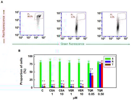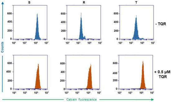 4.4. Examination of the TQR Inhibitory Effect on P-gp Efflux Activity in S, R and T Cells using the Calcein/AM Assay