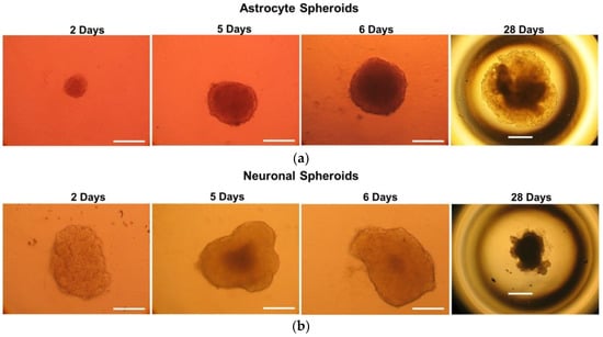 2.1. Monitoring of 3D Astrocyte and Neuron Spheroids over a 30 Day Culture Period