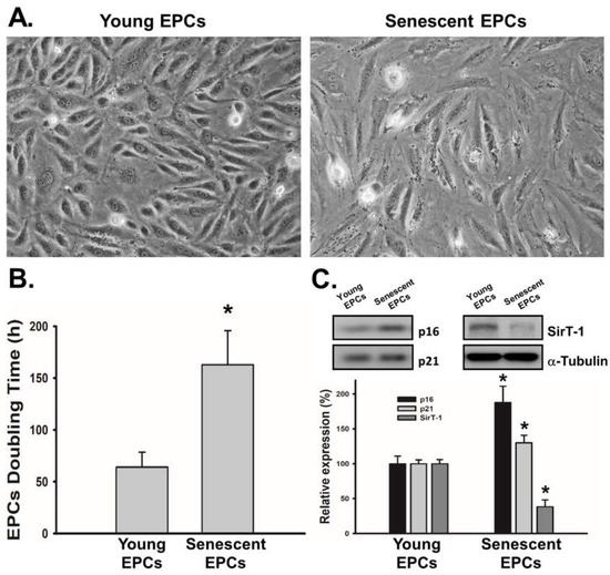 Senescence of endothelial progenitor cells (EPCs) was induced by serial passages. To obtain young and senescent EPCs, cells were grown in culture medium and serially passaged until their passage difference results in doubled cell doubling time. (A) The representative morphology of young and senescent EPCs was shown (phase contrast, 100×); (B) Cell doubling time was increased at least 2-fold in senescent EPCs after serial passages (N = 6); (C) For characterization of senescence in EPCs, the expression of senescence marker p16, p21 and sirtuin 1 (SirT-1) was determined by Western blot analysis (N = 6). Data are expressed as mean ± S.E.M. of six independent experiments. * p < 0.05 compared with the group of young EPCs.