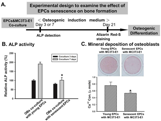 Effect of EPCs senescence on osteogenic function of osteoblasts. (A) Schematic diagram of the experimental design for EPCs and osteoblasts co-culture model. Murine osteoblast cell line (MC3T3-E1) cells were grown in co-culture with young or senescent EPCs, then incubated in the osteogenic induction medium for bone formation for the indicated times; (B) Alkaline phosphatase (ALP) activity of MC3T3-E1 cells decreased in co-culture with senescent EPC on day 3 and day 7 (N = 5); (C) Calcium deposition was decreased in MC3T3-E1 cells after co-culture with senescent EPC for 21 days (N = 5). Data are expressed as mean ± S.E.M. of five independent experiments. * p < 0.05 compared with the group of young EPCs.