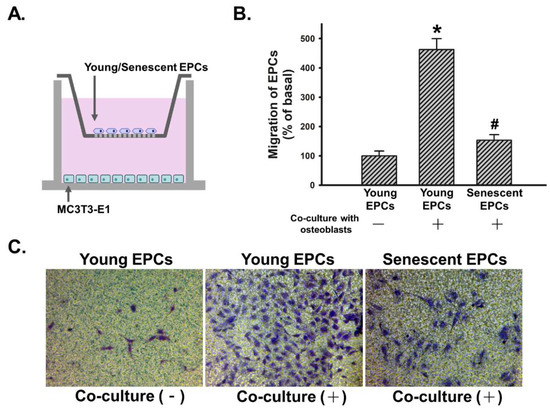 We evaluated the effect of osteoblast on migratory activity of EPCs, which is an indicator for EPCs’ initiation of angiogenesis, by co-culturing MC3T3-E1 with young or senescent EPCs in a transwell migration model (Figure 3A). In the absence of MC3T3-E1, EPCs did not actively migrate through the permeable membrane between two chambers. Meanwhile, young EPCs’ migration was stimulated while senescent EPCs demonstrated weakened migration in the co-culture model. Osteoblast-induced migratory activity of young EPCs was over two times higher than that of senescent EPCs (Figure 3B,C).