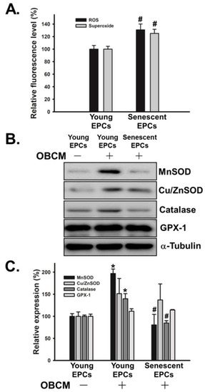 Effect of senescence on the content of ROS, superoxide, and antioxidant enzymes in OBCM-treated EPCs. (A) Young and senescent EPCs were incubated with OBCM of MC3T3-E1 cells for 24 h. Then, the production of ROS and superoxide was examined by ROS/superoxide detection kit (N = 5); (B,C) Young and senescent EPCs were treated with or without OBCM of MC3T3-E1 cells for 24 h. After treatment, cells were harvested and lysed for the detection of antioxidant enzymes by Western blot analysis (N = 5). The quantitative densitometry of the relative level of signals was performed with Image-Pro Plus. Data are expressed as mean ± S.E.M. of five independent experiments. * p < 0.05 compared with the basal group (without OBCM). # p < 0.05 compared with the group of young EPCs.