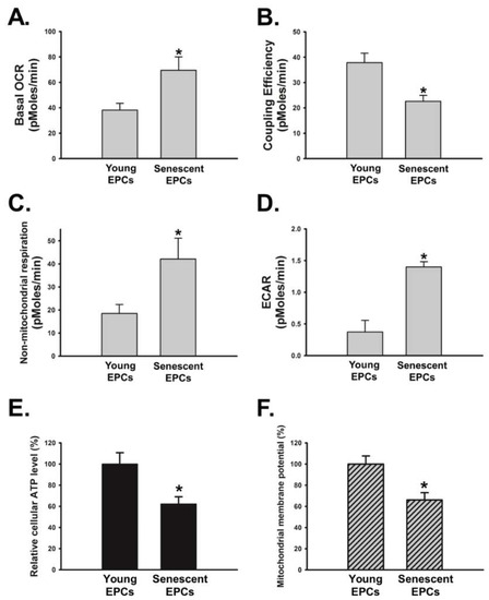 Alterations of both Akt/mTOR/p70S6K pathway and intracellular reduction-oxidation balance could lead to changes in cellular metabolism [36,37]. Therefore, we examined the dynamic change of oxygen consumption rate (OCR) and extracellular acidification rate (ECAR) in OBCM-treated EPCs. We found that basal OCR was higher in the senescent EPCs (Figure 6A). However, young EPCs had higher coupling efficiency than senescent EPCs (Figure 6B), which is an index of proton conductance and mitochondrial dysfunction [38]. Non-mitochondria respiration and extracellular acidification rate (ECAR), which is an indicator of activity of non-mitochondrial NADPH oxidases and glycolysis [38], respectively, were higher in senescent EPCs when compared with young EPCs (Figure 6C,D). Further investigation of cellular energetics showed significantly decreased cellular ATP and mitochondrial membrane potential in senescent EPCs when incubated with OBCM (Figure 6E,F).