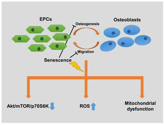 Schematic presentation of mechanism underling senescence-induced dysfunctions in endothelial progenitor cells and osteoblasts. Osteoblasts osteogenic activity and EPCs migratory activity both decreased in the co-culture system using senescent EPCs. Senescent EPCs decreased activation of Akt/mTOR/p70S6K signaling pathway, and elevated intracellular reactive oxygen species (ROS) and mitochondrial dysfunction (including decreased intracellular ATP and mitochondrial coupling efficiency) when co-cultured with osteoblasts.