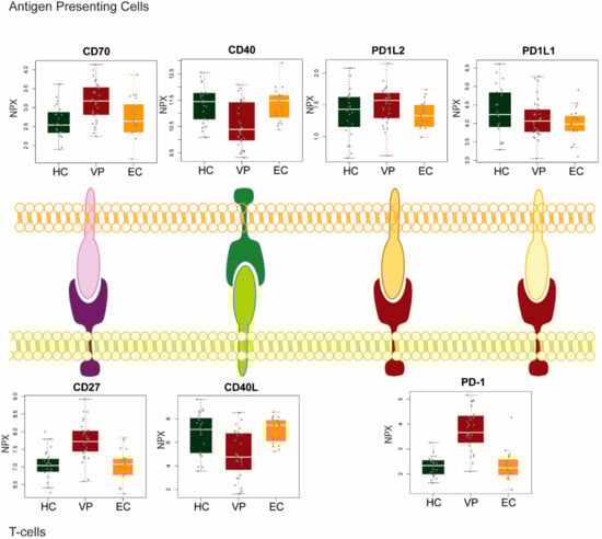 We recently investigated the soluble protein levels of receptor-ligand pairs CD27/CD70 and CD40/CD40 ligand (CD40L) in VP, EC, and HIV-1 negative HC [] (Figure 1). Our results showed distinct patterns among the different patient groups. While levels for both CD27 and CD70 were significantly increased in viremic progressors, CD40 and CD40L protein levels were significantly decreased compared to EC and HC (p < 0.01). Although both pairs constitute a co-stimulatory pathway, CD27/CD70 and CD40/CD40L signaling are affected in different ways while the virus is present in the body.