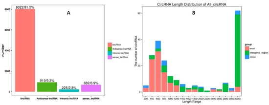 In our results, 9848 lncRNAs were found: 84 were known lncRNAs, and 9764 were novel lncRNAs found in the control and chilling samples (Table S1). Among them, most of the lncRNAs were lincRNAs (8022, 81.5%), followed by antisense-lncRNAs (919, 9.3%), sense lncRNAs (682, 6.9%), and intronic-lncRNAs (225, 2.3%) (Figure 1A). In addition, 213 novel circRNAs were found, with many emanating from chromosome 8 (Table S1). The majority of circRNAs were over 3000 nt and from intergenic regions, while additional circRNAs were between 400 to 800 nt and derived from exons (Figure 1B, Table S1). In total, 281 miRNAs were found in our libraries with 120 known and 161 novel miRNAs. Most of the novel miRNAs were between 21 and 24 nt. The miRNAs nucleotide bias was also analyzed in our results, and, intriguingly, we found that the first nucleic acid bases were U and A, while the last was G (Table S1).