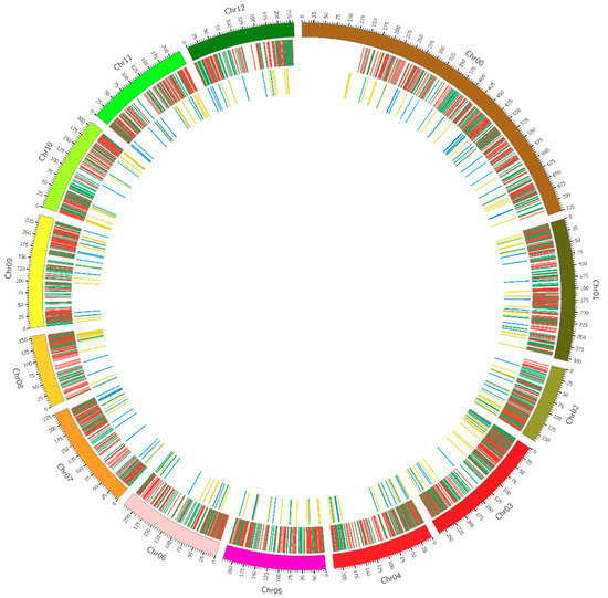 There are many differences between lncRNAs and mRNAs, including their lengths, exon numbers, open reading frames, and expression levels. The number of lncRNAs decreased with the increase of the length (<3000 nt), whereas, the length of mRNAs was distributed from 400 to ≥3000 nt and had two peaks at 400 nt and ≥3000 nt. The number of the corresponding exons of lncRNAs was much less than that of mRNAs and mainly below 10; the mRNAs contained many exons, from 1 to > 30. The length of the corresponding open reading frames of lncRNAs was mainly between 50 and 300 nt, while the length of the corresponding open reading frames of mRNAs was mainly between 100 and 1100 nt (Table S5). An interactive analysis of the expression of lncRNAs and mRNAs was also conducted, and their distribution on the different chromosomes was described (Figure 4).