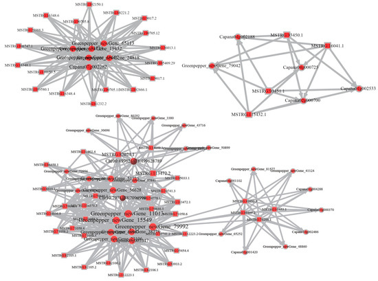 Recently, circRNAs were proposed to harbor miRNAs and were discovered to be enriched with functional miRNA-binding sites [41]. So far, there has been no report on ceRNAs in bell pepper fruit. Here, we constructed a lncRNA–circRNA–mRNA ceRNA network for bell pepper chilling stress based on our deep-sequencing data for the first time. In total, 162 mRNAs, 81 lncRNAs and 4 circRNAs were included in the ceRNA network. Several targets of the non-coding RNAs in the network were key enzymes in chilling injury, such as ATPase, which is an important enzyme in energy metabolism in bell pepper [42], serine/threonine protein kinase, and β-galactosidase, which are important in signaling and plant defense reaction and cell wall metabolism, respectively [37,43]. In addition, several transcription factors, such as ethylene-responsive transcription factor and heat shock factors, which play specific regulatory roles in the chilling response, were identified [44,45]. In addition, a pathway network was also constructed with the key genes of the KEGG analysis, revealing that the most important pathway was involved in lipid transport and metabolism, which are important in the chilling stress process [46,47]. These findings provide a theoretical basis for deciphering novel mechanisms of chilling injury and for the functional characterization of ceRNA networks in the future studies.