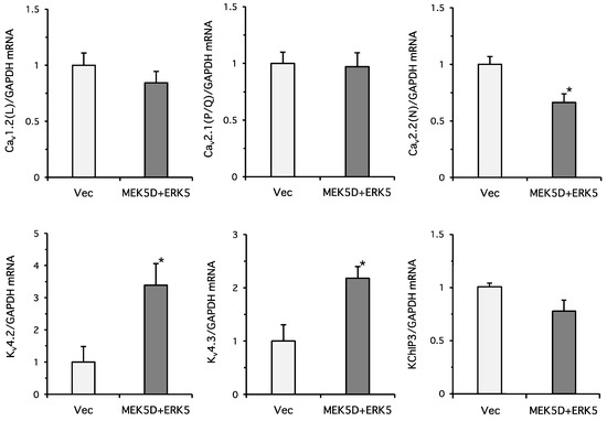 ERK5 promotes gene expression of Kv4.2 and Kv4.3 in PC12 cells. PC12 cells were transfected with empty vector (Vec) or MEK5 and ERK5. Two days after transfection, the total RNA was isolated from the cell lysates and RT-qPCR was performed using specific primers for Cav1.2, Cav2.1, Cav2.2, Kv4.2, Kv4.3, and KChIP3. ERK5 significantly promoted the gene expression of Kv4.2 and Kv4.3, and attenuated Cav2.2 expression (two independent experiments in triplicate (n = 6), * p <0.05, unpaired Student’s t-test).