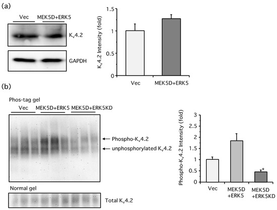 We next examined the protein levels of Kv4.2 after th eERK5 activation in PC12 cells. Surprisingly, although the mRNA levels were increased, the protein levels were not altered significantly (Figure 3a). In addition to expression levels, we investigated the phosphorylation status of Kv4.2, because it has been reported that ERK1/2 phosphorylates at least three Ser/Thr residues at the C-terminus of Kv4.2 and both ERK5 and ERK1/2 preferentially phosphorylate Ser/Thr residues that have a similar minimum consensus sequence (i.e., Ser/Thr-Pro) [24,26,27]. We used a Phos-tag reagent, which tightly binds phosphorylated amino acids in the presence of Mn2+ or Zn2+. In principle, the Phos-tag-mixed sodium dodecyl sulfate-polyacrylamide gel electrophoresis (SDS-PAGE) causes a band-shift of phosphorylated proteins, and they can be clearly distinguished from unphosphorylated proteins. The overexpression of MEK5D and ERK5 caused the band-shift of Kv4.2, which was significantly diminished by the dominant-negative ERK5 kinase-dead mutant (ERK5K83M, or ERK5KD for short), suggesting that ERK5 signaling promoted phosphorylation levels of Kv4.2 (Figure 3b).