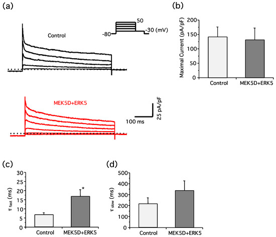 ERK5 inhibits inactivation of the A-type current in PC12 cells. PC12 cells were co-transfected with EGFP, MEK5D, and ERK5. Two days after transfection, the A-type current was recorded. (a) Representative traces and step-pulse protocol are shown; (b) maximal peak current was measured at +50 mV. The ERK5 did not significantly change amplitude levels (data from three independent experiments (n = 4), unpaired Student’s t-test); (c,d) the time constant (τ) at fast (c) and slow (d) phases at +50 mV was calculated. ERK5 significantly changed the time constant (τ) at the fast phase (data from three independent experiments (n = 4), * p <0.05, unpaired Student’s t-test).