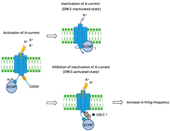 Adjusting the classical Hodgkin–Huxley models, Rush and Rinzel studied the effects of the A-current on the steady firing rate of neurons. They showed that the number of spikes per burst increases as the conductance of the A-current decreases and as inactivation decreases [32]. When ERK5 was activated, the A-current inactivation rate was reduced in our results (Figure 4). According to their model, we assume that ERK5 may contribute to more rapid repolarization toward the resting potential for responding to the next firing. Therefore, ERK5 may increase the firing frequency through the phosphorylation of Kv4.2.