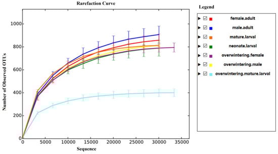 The proportion which equaled the number of high quality sequences/valid sequences was over 97% in each development stage (Table 1). Briefly, raw sequencing reads with exact matches to the barcodes were assigned to respective samples and identified as valid sequences. The low-quality sequences were filtered through the following criteria: sequences that had a length of <150 bp, sequences that had average Phred scores of <20, sequences that contained ambiguous bases, and sequences that contained mononucleotide repeats of >8 bp. Following sequence trimming, quality filtering, and removal of chimeras, the number of sequences per sample (overwintering mature larval, overwintering female adult, overwintering male adult, neonate larvae, mature larvae, female adult, and male adult) was 41,015 ± 2088, 47,239 ± 2773, 43,208 ± 1023, 45,476 ± 1562, 46,214 ± 1804, 45,491 ± 2324, 43,728 ± 1163, respectively. The rarefaction curves indicated that species representation in each sample approached the plateau phase, and it was unlikely that more fungi would be detected with additional sequencing efforts (Figure 1).