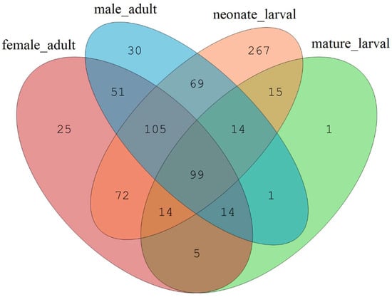 T. klimeschi undergoes complete metamorphosis: larvae and adults differ greatly in form and function. This study divided the relatively long larval stage into neonate larval and mature larval stages. The high-quality sequences were clustered into different OTUs (Operational Taxonomic Units) by the UPARSE pipeline at a 3% dissimilarity level. The authors found abundant fungi persisted in all development stages of T. klimeschi but, the diversity and structure of the T. klimeschi—associated fungal community varied significantly across host development stages. A Venn diagram was used to compare the similarities and differences between the communities in different development stages (Figure 2). Subsequent to sequence standardization, the fungal community in the neonate larvae was more diverse than the community identified in the mature larvae. Fungal community richness further increased in adults. Chao and ACE (Abundance-based Coverage Estimator) index values suggested that the fungal community richness decreased from neonate larvae to mature larvae then increased from mature larvae to adult (Table 2).