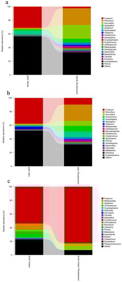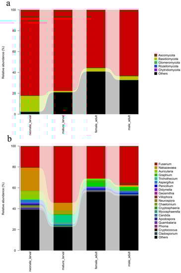 Differences in the community composition among different development stages were tested using the Duncan’s test for multiple comparisons. The genera Nakazawaea, Trichothecium, Aspergillus, Didymella, and Villophora which belonged to the Ascomycota; and Auricularia which belonged to Basidiomycota were more prevalent in the larvae samples (p ≤ 0.05). Nakazawaea, Aspergillus, Villophora, and Auricularia were abundant and active in neonate larvae, while Trichothecium and Didymella significantly increased in mature larvae (p ≤ 0.05). Adults harbored high proportions of Graphium which belonged to Ascomycota (p ≤ 0.05). The author also found Fusarium, which belonged to Ascomycota, persisted through metamorphosis and did not have a significant change in relative content (p > 0.05). Furthermore, Fusarium was the most abundant genus in different development stages (Figure 3b) (See Table A1 in Appendix A).