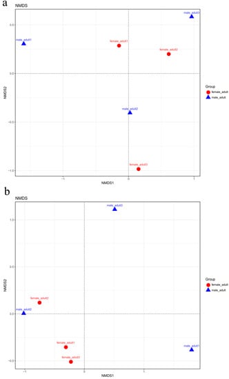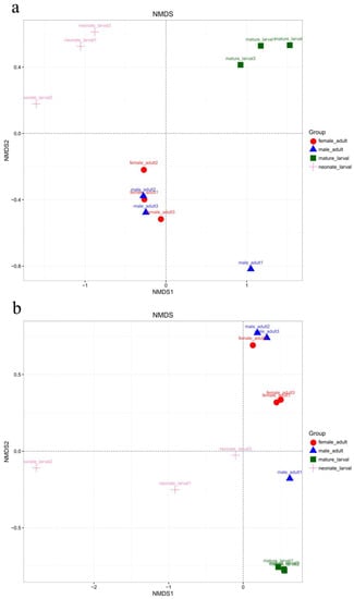 The authors compared community structures between samples using Nonmetric multidimensional scaling (NMDS) that revealed the development pattern in each life stage for the unweighted and weighted UniFrac distances (Figure 4). According to the unweighted UniFrac NMDS, neonate larvae and mature larvae formed a unique cluster, separated from the adults. According to principal coordinates (NMDS1 and NMDS2), the differences in fungal communities were great between neonate larvae, mature larvae and adults, while the differences were small in adult females compared with adult males. According to the weighted UniFrac NMDS, the neonate larval, mature larval and adults were separated and clustered based on NMDS1and NMDS2.