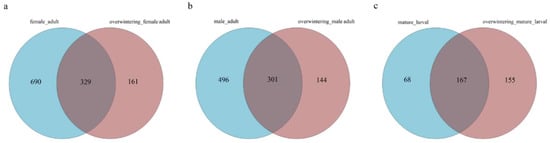 Venn diagram representing the distribution of the fungal OTUs in different generations of T. klimeschi. (a) Adult females vs. overwintering adult females; (b) adult males vs. overwintering adult males; (c) mature larvae vs. overwintering mature larvae.