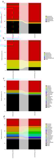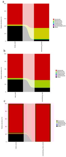 To identify gut fungal community structure succession in different sexes, the ITS sequences were classified at the phylum, class, order, and family levels. There were notable trends and changes in the relative abundance of the different fungi taxa in different sexes (Figure 10a,b). There were no significant differences of gut fungal community between females and males (see Table A4 in Appendix A).