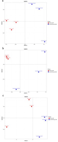Differences in the community composition among different sexes were tested using the Duncan’s test for multiple comparisons. The community structure of fungi between adult males and females were similar (Figure 10c,d) (See Table A5 in Appendix A).