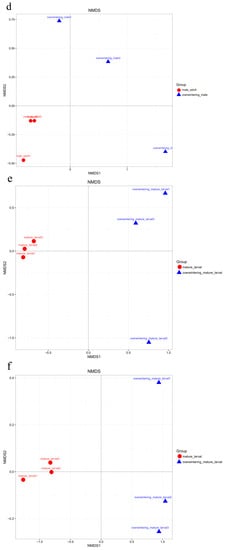 Nonmetric multidimensional scaling analysis of the Bray–Curtis dissimilarity index of the fungal community OTUs (≥97% identity) in different generations of T. klimeschi based on Illumina sequencing of ITS genes. Adult females vs. overwintering adult females: (a) Unweighted; (b) Weighted; adult males vs. overwintering adult males: (c) Unweighted; (d) Weighted; mature larvae vs. overwintering mature larvae: (e) Unweighted; (f) Weighted.