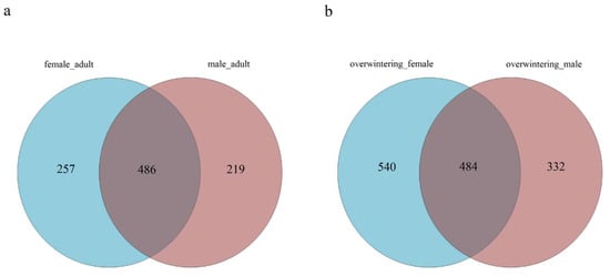 Venn diagram representing the distribution of the fungal OTUs in different sexes of. (a) Adult females vs. adult males; (b) overwintering adult females vs. overwintering adult males.