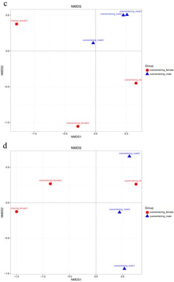 Nonmetric multidimensional scaling analysis of the Bray–Curtis dissimilarity index of the fungal community OTUs (≥97% identity) in different sexes of T. klimeschi based on Illumina sequencing of ITS genes. Adult females vs. adult males: (a) Unweighted; (b) Weighted; overwintering adult females vs. overwintering adult males: (c) Unweighted; (d) Weighted.