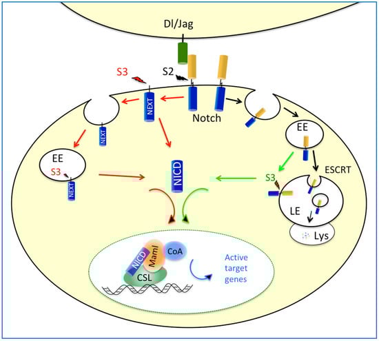 A variety of post-translational events, including ubiquitination and endocytic trafficking have been shown to regulate the Notch core pathway, allowing context specific regulation. Upon ligand-dependent generation of the membrane-bound NEXT fragment, Notch activation proceeds through the γ-secretase-dependent proteolytic cleavage at S3 to release NICD, which mostly occurs at the cell surface. However, studies in Drosophila development have revealed that S3 cleavage of NEXT also occurs after internalization in early endosomes [] and endosomal entry is required for efficient activation of the pathway [] (Figure 1). In line, positive regulators of endosomal trafficking, such as Dynimin and Rab5, have been shown to promote canonical ligand-dependent activation of Notch signaling []. Furthermore, earlier studies in human cells have shown that Notch monoubiquitination is required for both the internalization in early endosome and γ-secretase cleavage []. Several studies suggest that the E3 ubiquitin ligase Deltex is the enzyme responsible for NEXT monoubiquitination and internalization in early endosomes []. Adding a further level to the regulation of Notch endocytic trafficking, Moretti et al. [] showed that NEXT deubiquitination is also required for γ-secretase cleavage and release of NICD. Major negative regulators of Notch endocytic activation are Numb and Numb-like proteins, which alter the endocytic route of Notch receptor by promoting its degradation []. Besides their function in cell fate decision during development [], Numb proteins act as tumor-suppressor of oncogenic Notch signaling during tumorigenesis [].