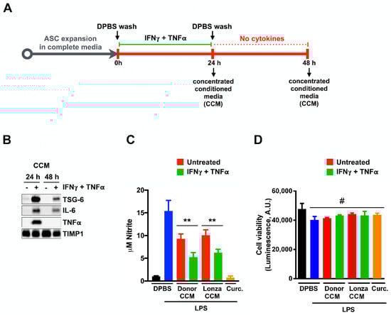 Cytokine priming of adipose stem cells (ASCs) enhances the anti-inflammatory composition of conditioned medium. (A) Schema for preparation of exogenous cytokine-stimulated ASC concentrated conditioned medium (ASC-CCM). ASCs are expanded in culture media, washed with Dulbecco’s phosphate-buffered saline (DPBS), and then cultured in media with 10 ng/mL IFNγ, 20 ng/mL Tumor necrosis alpha (TNFα) for 24 h. Cells were then washed with DPBS and cultured for an additional 24 h without IFNγ or TNFα. Conditioned media collected at that time was concentrated (CCM) using centrifugal concentrators with a 3 kDa molecular weight cutoff. (B) Immunoblot analysis of TNF-stimulated gene 6 protein (TSG-6), Immunomodulatory Interleukin-6 (IL-6), TNFα, and tissue inhibitor of matrix metalloproteinase 1 (TIMP1) in CCM from untreated or cytokine treated ASCs at t = 24 h or 48 h of the aforementioned preparation scheme. ASC-CCM was normalized to 50 μg/mL in each sample. (C) Biochemical assessment of NO release from BV2 cells using the Griess assay. BV2 cells were treated with 5 μg/mL of 48 h CCM from untreated (red bars) or cytokine treated (green bars) donor derived (Donor CCM) or Lonza ASCs (Lonza CCM) for 1 h then with 50 ng/mL Lipopolyaccharide (LPS) for an additional 24 h. To determine baseline and maximum nitrite, BV2 cells were treated with DPBS alone (black bar) or with DPBS and then LPS (blue bar). Curcumin (Curc.; 10 μM) was used as a positive control for suppression of LPS-mediated activation (orange bar). Data represent Mean ± SD from at least three technical replicates. **, p < 0.01 (D) Luminescence-based assessment of BV2 viability using Cell-TiterGlo. #, p > 0.05. Data represent Mean ± SD from at least three replicates.