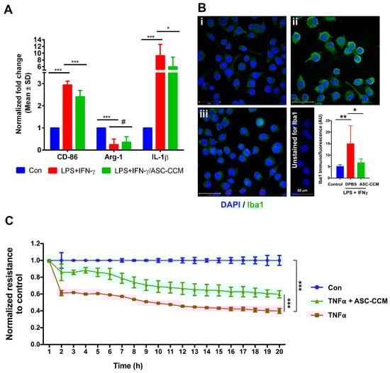 ASC-CCM suppresses microglial activation and improves trans-endothelial resistance. (A) ASC-CCM suppresses the LPS (100 ng/mL) and IFNγ (10 ng/mL) induced pro-inflammatory gene expression of BV2 cells. Assessment of gene expression by Sybr Green qPCR and expressed as fold change normalized to internal control (GAPDH) in the study groups. Data represent Mean ± SD from three separate experiments performed in duplicate. *, p < 0.05; ***, p < 0.001; #, p > 0.05. (B) ASC-CCM reduces microglial activity as shown by the decreased Iba1 immunoreactivity with LPS and IFNγ stimulated BV2 cells after 12 h exposure. Bar graph shows quantification of mean fluorescence intensity of Iba1. Data are Mean ± SD performed in duplicates. *, p < 0.05; **, p < 0.01. Scale bar = 50 µm. (C) Trans-endothelial resistance is protected by ASC-CCM in vitro. Representative electric cell-substrate impedance-sensing (ECIS) tracings plotted as normalized resistance expressed as Mean ± SD of single experiment performed in replicates with similar data from two independent experiments. ***, p < 0.001.