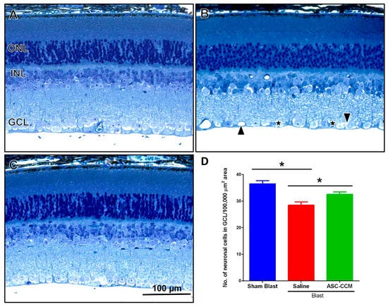 In sham group retina receiving saline, the outer nuclear layer (ONL) of central retina contained 10–12 rows of nuclei with lightly dispersed chromatin and intact photoreceptor outer segments, and a well-organized inner nuclear layer (INL) and ganglion cell layer (GCL) (Figure 4A). In blast group retinas receiving saline, the ONL and INL appeared normal when compared to sham group retina. However, focal changes were observed in the GCL, with neuronal cells reduced in blast group retina (Figure 4B). On the contrary, in ASC-CCM injected group retinas after blast, the GCL integrity was maintained as compared to that in blast injury animals receiving saline (Figure 4C). Quantitative analysis utilizing toluidine blue stained light micrographs revealed significant reduction in the neuronal cell count in GCL from blast group mice receiving saline when compared to sham mice (28.49 ± 2.9 vs. 36.49 ± 2.67 cells/100,000 µm2 area, p < 0.05) with a preservation by ASC-CCM injection as compared to blast mice receiving saline (32.56 ± 2.2 vs. 28.49 ± 2.9 cells/100,000 µm2 area, p < 0.05) (Figure 4D).